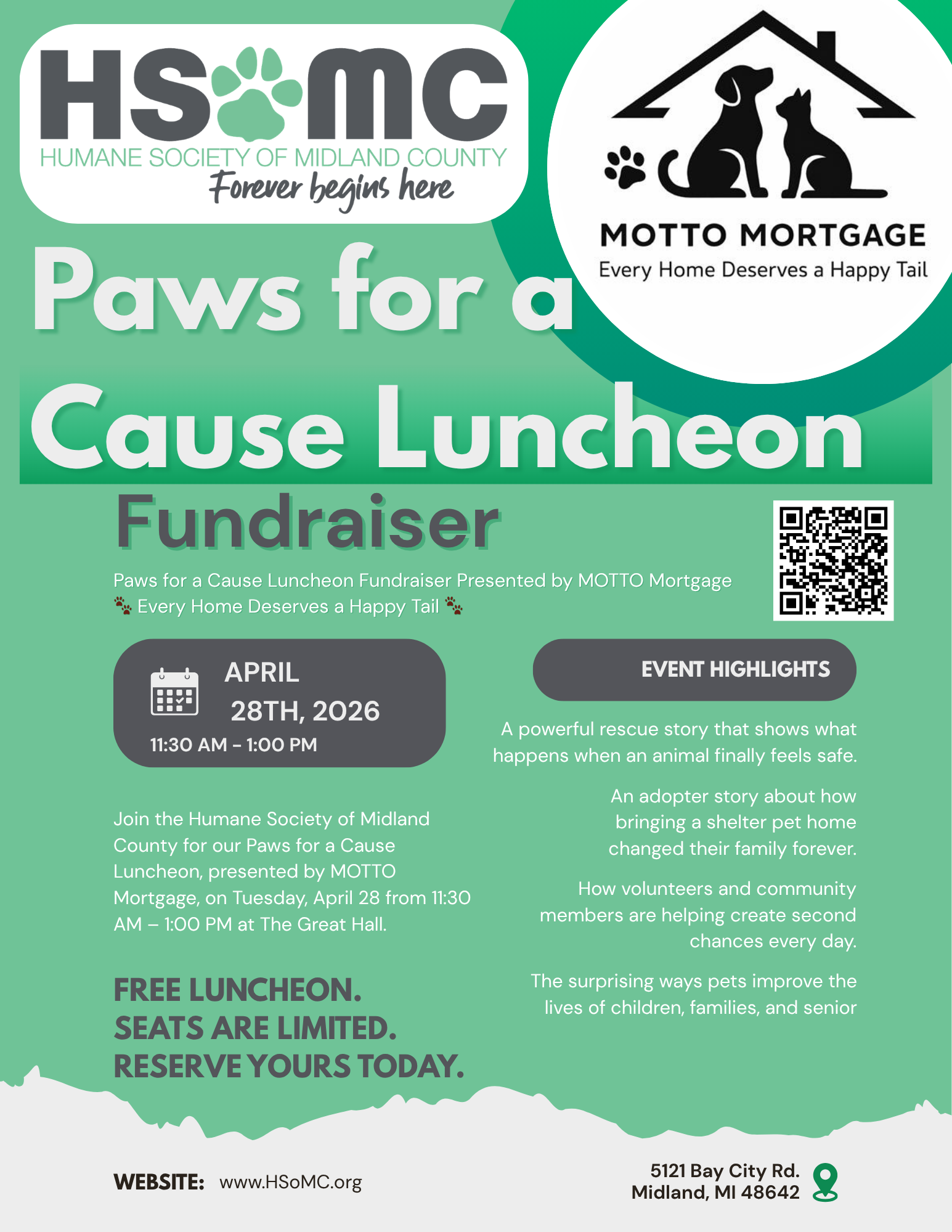 Join us Tuesday, April 28th, for our Paws for a Cause Luncheon Fundraiser, presented by Motto Mortgage. Where we’ll share meaningful stories, community impact, and the power of a place to call home.